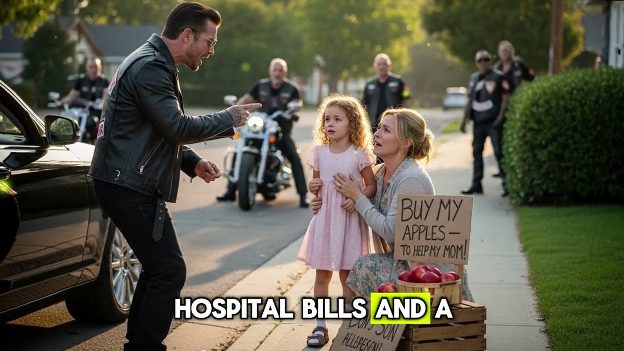 O líder do grupo desceu da moto. Era um homem alto, barba grisalha, braços cobertos por tatuagens e olhar firme. Chamava-se Reed. Ele caminhou até o trio, observando em silêncio: a mãe ajoelhada, a criança assustada e o homem arrogante. Sem pressa, abaixou-se, pegou uma maçã que rolara até seus pés e olhou para Adrien.